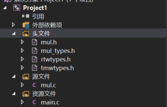 【注意】:需要注意的是,需要将上面提到的.h文件放置到头文件文件夹中,选中“头文件”右键——>“添加”——>“现有项”: 然后将mul.c文件放置在源文件文件夹中,最后在资源文件文件夹中新建一个main.c文件,整体文件目录如下: