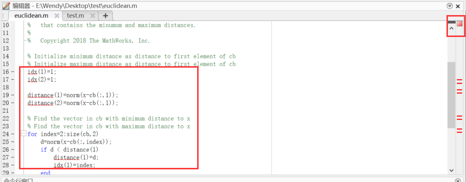 5.1 准备用于产生代码的MATLAB算法首先自己新建一个文件夹,然后将教程文件从文件夹 matlabroot\help\toolbox\coder\examples\euclidean 复制到本地工作文件夹。此处,matlabroot 是 MATLAB 安装文件夹,例如 C:\Program Files\MATLAB\R2019a。要将这些文件复制到您的当前文件夹,首先需要打开MATLAB,然后进入该文件夹下,最后再命令行窗口中输入如下命令: