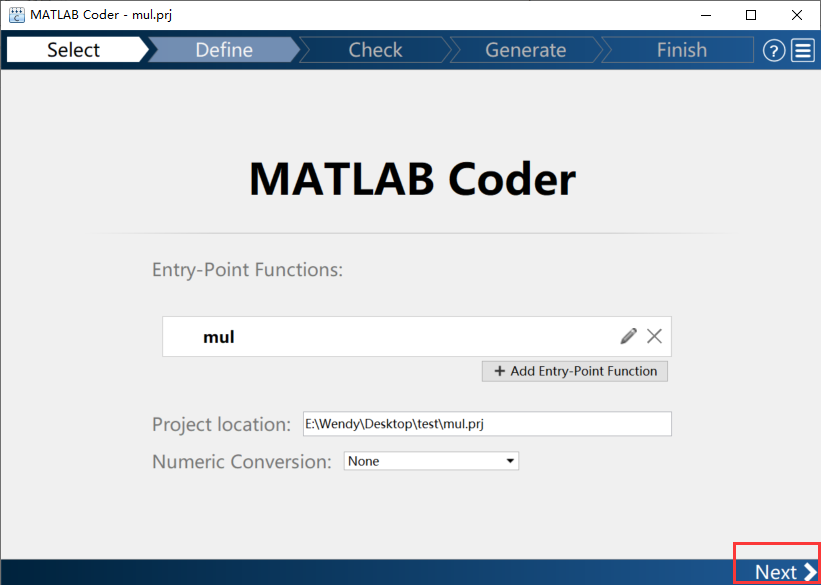 在命令窗口,输入mex-setup,选中一个存在的编译器; 然后打开MATLAB Coder, 第一步——选择源文件, 选择需要转换成C/C++的文件名:这里选择mul.m,选择完成后,点击右下角的Next进入第二步 第二步——定义输入类型, 为每个入口点函数定义输入类型,这里如果有主函数,直接选择主函数即可,MATLAB会自动推导出该函数的输入类型: 选择主函数后,点击右侧的“Autodefine Input Types”,MATLAB会自动进行推导,推导后如下图所示: