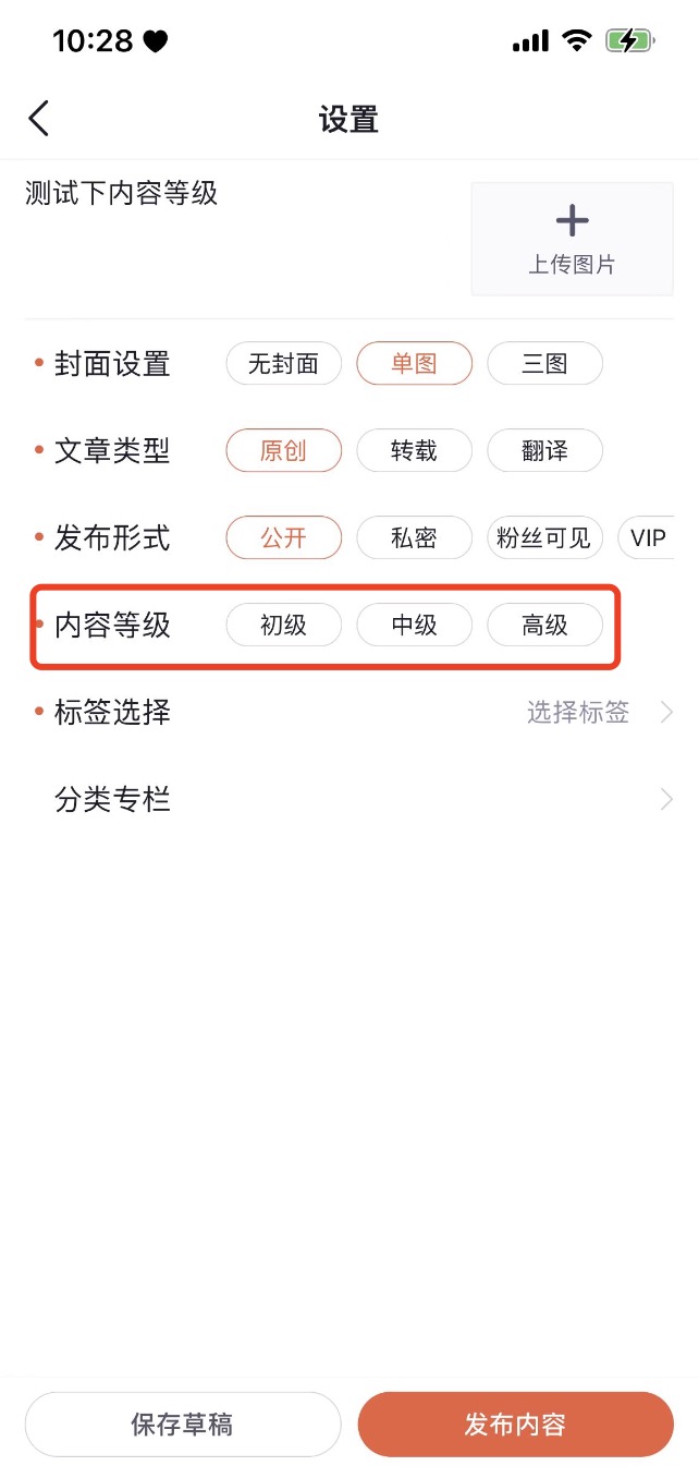 - 当发布形式为「公开、粉丝可见、VIP」时,内容等级为必填项