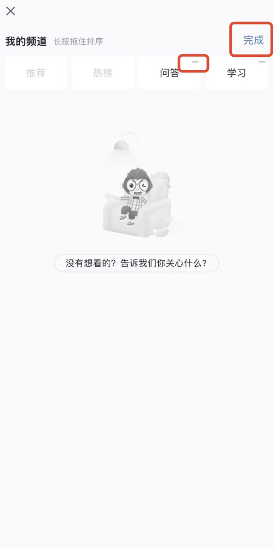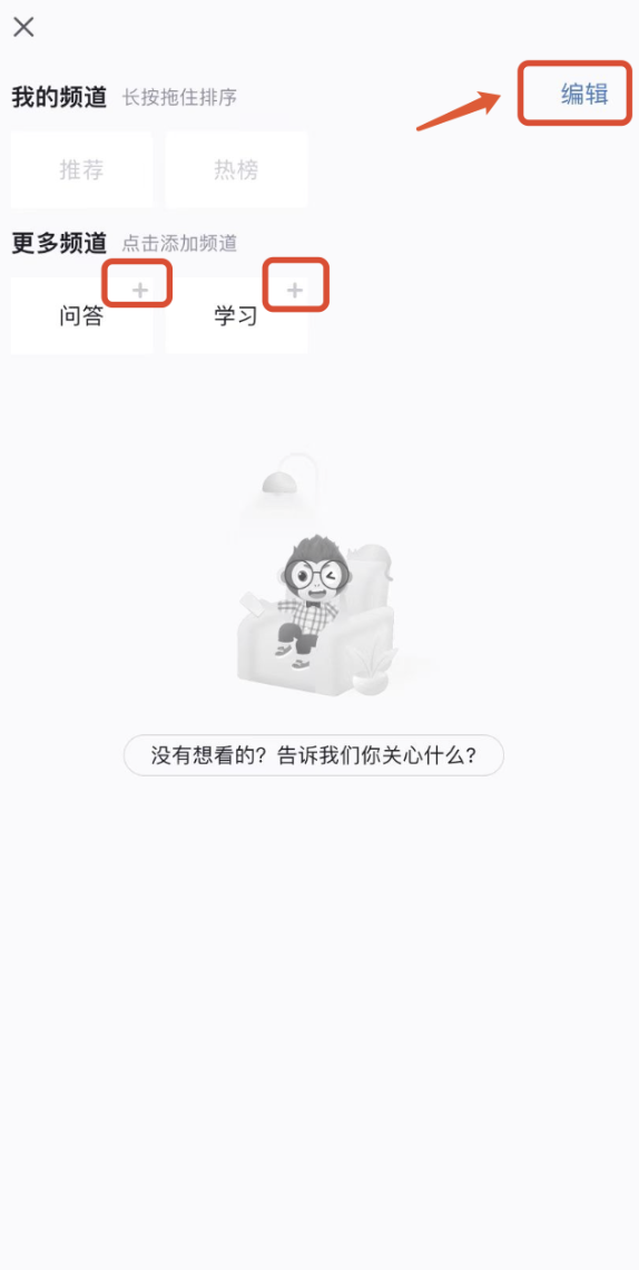 点击首页右侧「=」,进入「我的频道」窗口。点击编辑,选择想要关注的频道,点击「+」后即可添加;通过拖拽,调整频道顺序;点击「-」,可减少频道展示;调整结束后依次点击「完成」、「x」,首页将自动刷新。