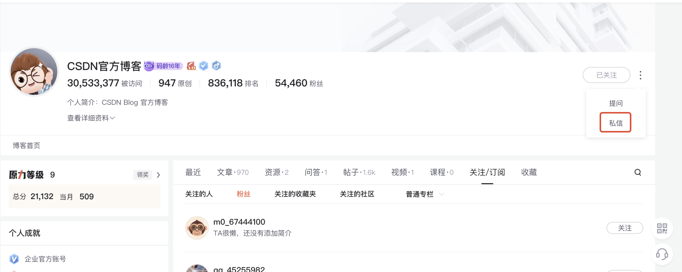 Step 2:在CSDN APP端,选择要拉黑的用户,打开其个人主页