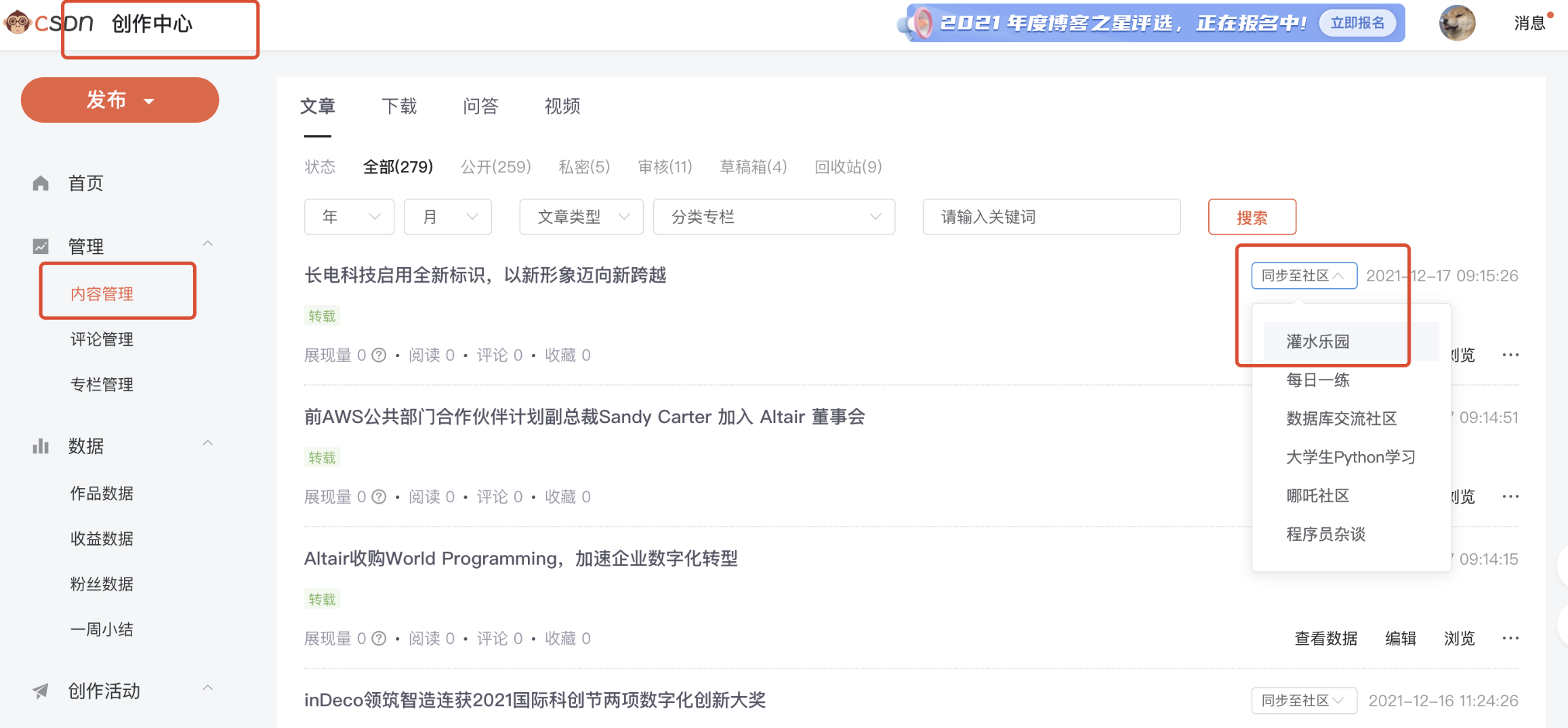 一、首页内容展示优化 1、首页热榜推荐流及CSDN排行榜增加「收藏排序」选项,点击后,该排序内容将按照30天内博文的收藏量进行降序排列step1、打开「创作中心」-「内容管理」页面,选择想要同步的博客,点击「同步至社区」按钮;