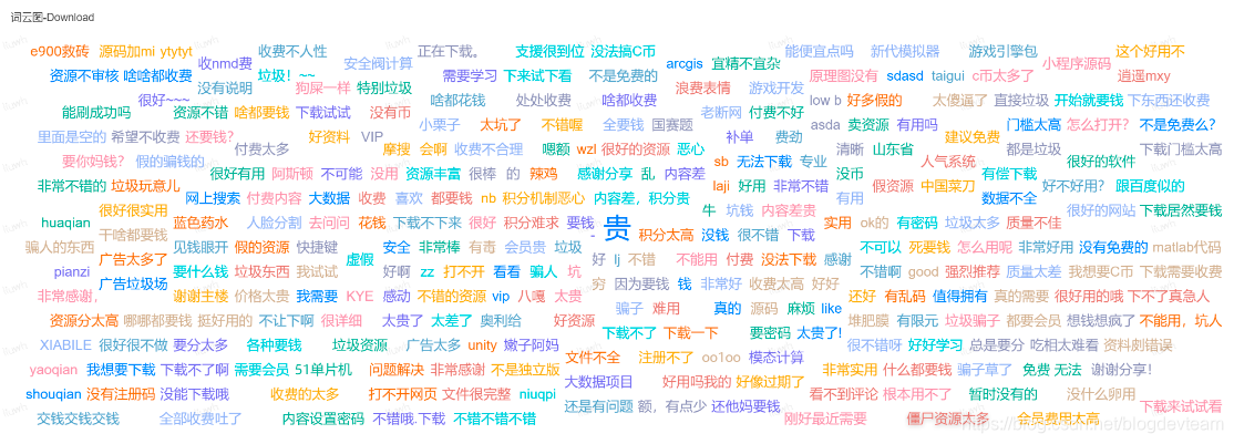 槽点词云图,槽点主要还是集中在“会员太贵、积分过高”以及“没有预览图、内容无用、资源质量低”这两个方面,对此,下载团队做了以下优化: