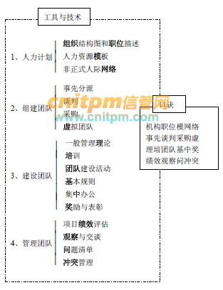 第三章 技术与工具1、人力计划:组织结构图和职位描述、人力资源模板、非正式人际网络 2、组建团队:预先分派、谈判、采购、虚拟团队 3、建设团队:人际关系理论,管理理论、培训、团队建设活动、基本规则、集中办公、奖励与表彰 4、管理团队:项目绩效评估、观察与交谈、问题清单、冲突管理