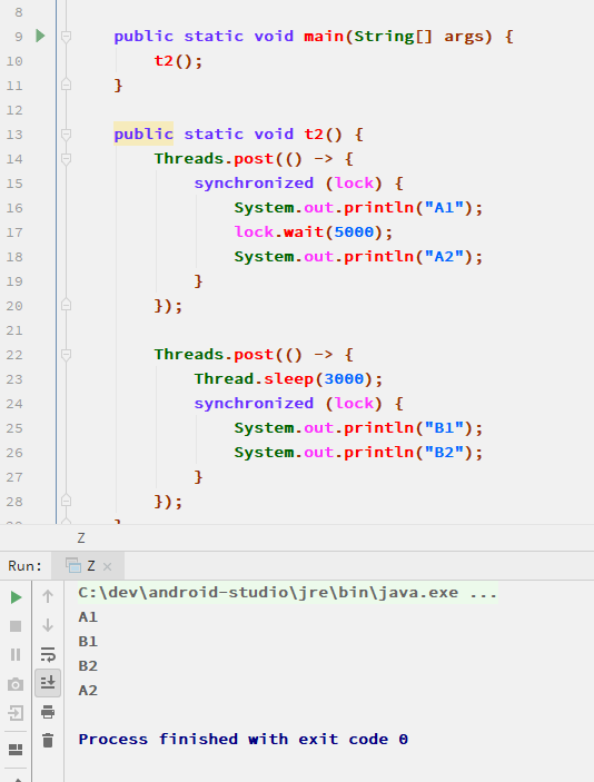 如果代码里面改成调用lock.notifyAll(),则t1和t2都会执行全部语句
