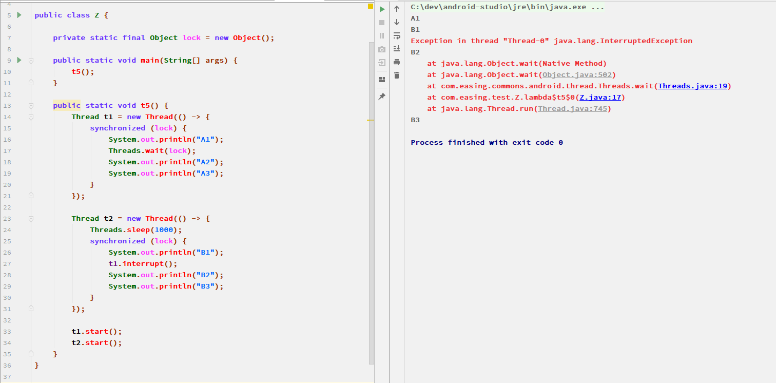 由于Thread很多api要强制进行异常处理,为了更简洁直观地展示核心代码,封装了一个Threads类,把异常处理代码屏蔽了