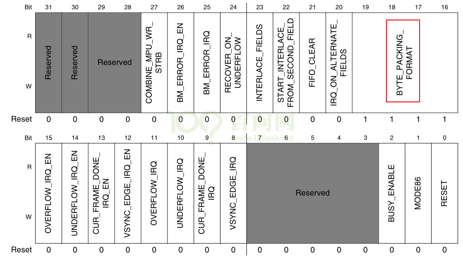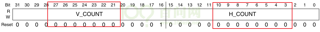 位域名读写描述[19:16]BYTE_PACKING_FORMATR/W用来表示一个32位的word中,哪些字节是有效的,即哪些字节是用来表示颜色的。 bit16、17、18、19分别对应byte0、1、2、3;某位为1,就表示对应的字节有效。 默认值是0xf,表示32位的word中,所有字节都有效。 对于8bpp,可以忽略本设置,所有的字节都是有效的; 对于16bpp,bit[1:0]、bit[3:2]分别对应一个字节,组合中的2位都为1时,对应的字节才有效; 对于24bpp,0x7表示32位数据中只用到3个字节,这称为“24 bit unpacked format”,即ARGB,其中的A字节被丢弃[0]RESETR/W用来复位了接的LCD, 0:LCD_RESET引脚输出低电平; 1:LCD_RESET引脚输出高电平 2.3 LCDIF_TRANSFER_COUNT寄存器 本寄存器用来设置Vsync信号相关的时序,及极性。
