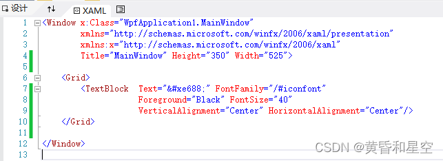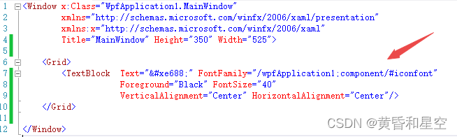 修改MainWindow.xaml代码如下 从图中可以看到我将TextBlock的FontFamily设置为"/#iconfont",其中符号’/‘表示当前程序集根路径,符号’#'是引用外部字体的固定标识,"iconfont"表示字体的名字。当然这里的iconfont就和咱们创建项目时的参数有关系了