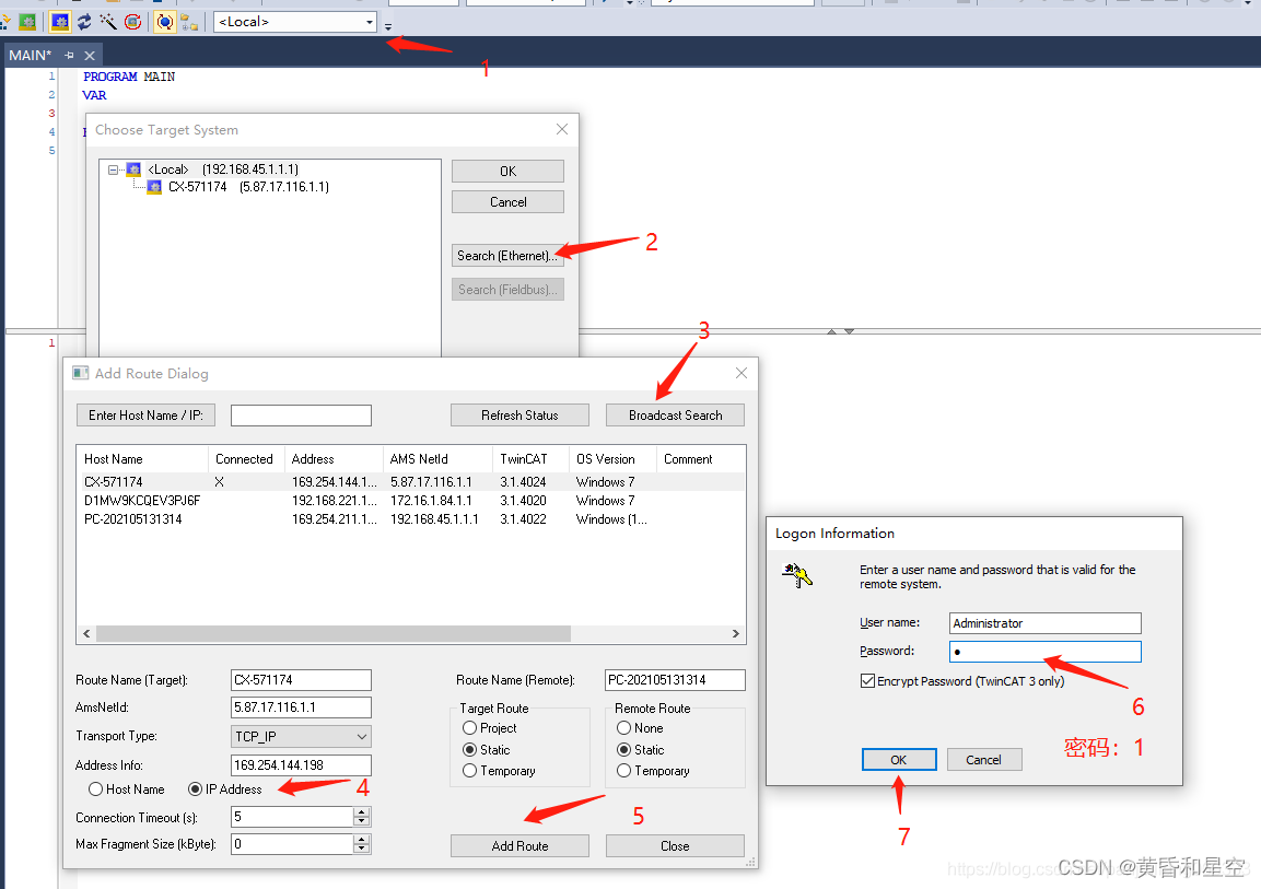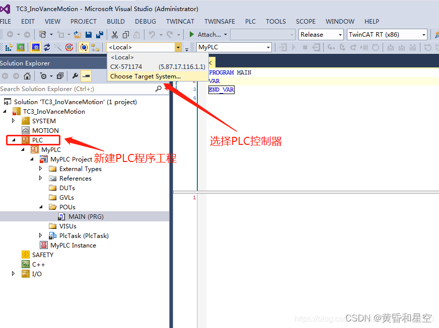 2、新建Tw inCAT3工程、新建PLC工程。然后和PLC控制器建立连接。