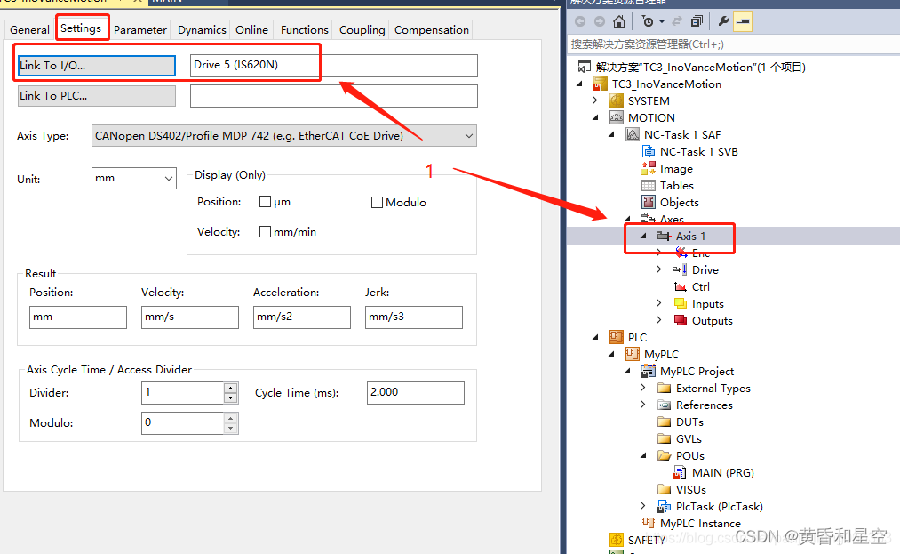 4、IO成功扫描到伺服后,MOTION-Axes中也会自动添加Axis轴,并且和IO中扫描到的轴Link关联起来。