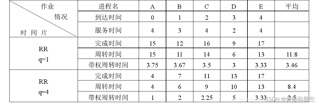 时间片轮转RR进程调度算法 1.基本概念 在轮转(RR)法中,系统将所有的就绪进程按FCFS策略排成一个就绪队列。系统可设置每隔一定时间(如30 ms)便产生一次中断,去激活进程调度程序进行调度,把CPU分配给队首进程,并令其执行一个时间片。当它运行完毕后,又把处理机分配给就绪队列中新的队首进程,也让它执行一个时间片。 在RR调度算法中,应在何时进行进程的切换,可分为两种情况:① 若一个时间片尚未用完,正在运行的进程便已经完成,就立即激活调度程序,将它从就绪队列中删除,再调度就绪队列中队首的进程运行,并启动一个新的时间片。② 在一个时间片用完时,计时器中断处理程序被激活。如果进程尚未运行完毕,调度程序将把它送往就绪队列的末尾。 2.例题 q = 1和q = 4时进程的周转时间如下 解析如下: 以q=4为例,当进程A到达时间=0,服务时间=4,正好是一个时间片的时间q。所以完成时间=4,周转时间=完成时间-到达时间=4,带权周转时间=周转时间/提供服务的时间=4/4=1。 为了更好理解,我们看继续进程B:由于进程B在A执行一个时间片之后,所以B进程的等待时间=4,一个新的时间片到来,进行执行进程B,而进程B的服务时间为3,小于一个时间片,因此进程B可以在一个时间片内结束,而且可以提前激活调度程序。B进程的完成时间=等待时间+服务时间=4+3=7,周转时间=完成时间-到达时间=7-1=6,带权周转时间=周转时间/提供服务的时间=6/3=2。