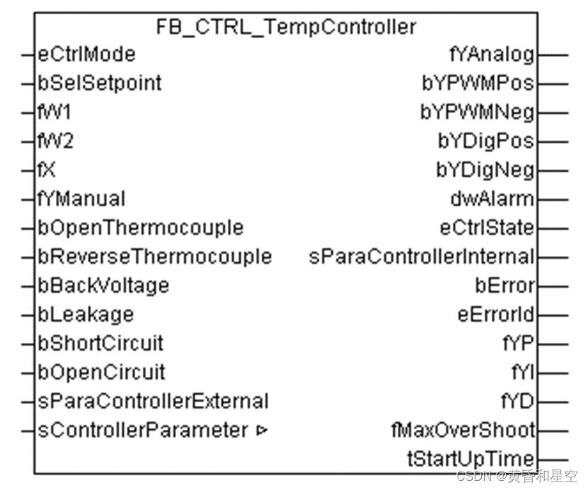 本文介绍了Beckhoff温度控制功能块的功能与参数,温度控制,pid,pwm输出 Beckhoff CX1001-0122 嵌入式控制器 KL2012 数字量输出模块 KL3314热电偶模块 Kl2761 调光模块 KL9260 交流电供电模块 固态继电器 2.硬件连接 (1)将cx控制器与KL模块连接 (2)将热电偶接入到KL3314模块中,作为温度反馈,以形成闭环控制 (3)根据输出类型不同,有以下两种连接方式 模拟量输出: 首先将KL2761模块通过KL9260模块进行供电,然后将烤箱电热棒的电源线接入到KL2761的第一通道中,程序通过模拟量对KL2761的输出电流进行控制,从而影响电热棒的加热功率。 PWM输出: 3.软件配置 (1)将程序编译后添加到PLC-Configuration中 (2)将Main_Simu.fxValue于Kl3314的第一通道相连接 (3)按照输出方式不同,将Main_Simu.byPWMPos与Kl2012的第一通道相链接或将Main_Simu.fyValue与KL2761的第一通道链接 (4)激活配置并将systemmanager切换到run模式下 二、功能块与结构体简介 (1)功能块描述: