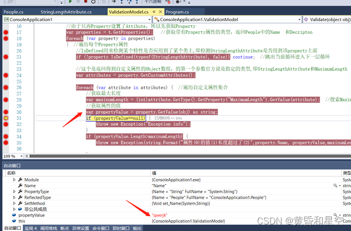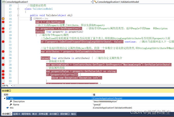 这里用到了反射,因为Attribute一般都会和反射一起使用,这里验证了字符串长度是否超过所要求的,如果超过了则会抛出异常 private static void Main(string[] args) { var people = new People() { Name = “qweasdzxcasdqweasdzxc”, Description = “description” }; try { new ValidationModel().Validate(people); } catch (Exception ex) { Console.WriteLine(ex.Message); } Console.ReadLine(); } 1.3. 实际效果测试 建立C#控制台应用程序,实例化一个对象,并赋值,如下所示: