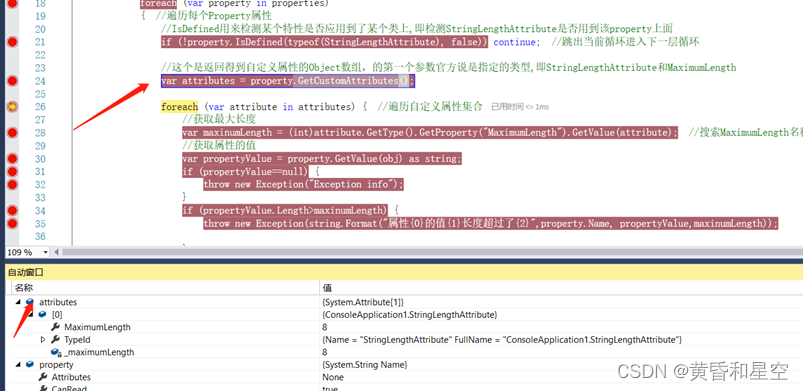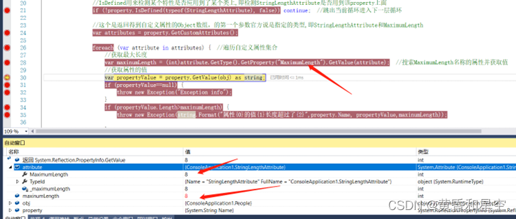 接下来是判断获取的Name属性的值和特性中定义的最大长度比较,属性值不存在或者超出特性中定义的最大长度,则抛出异常,如下所示: 实际长度是8,因此没有超出。
