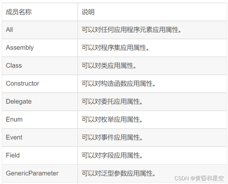 AttributeUsage这个系统提供的一个Attribute,作用来限定自定义的Attribute作用域,这里我们只允许这个Attribute运用在Property上,内建一个带参的构造器,让外部传入要求的最大长度。 AttributeUsage AttributeTargets在C#的类中,有的类加上了[AttributeUsage(AttributeTargets.Property)]这个是起什么作用的呢?AttributeTargets 枚举
