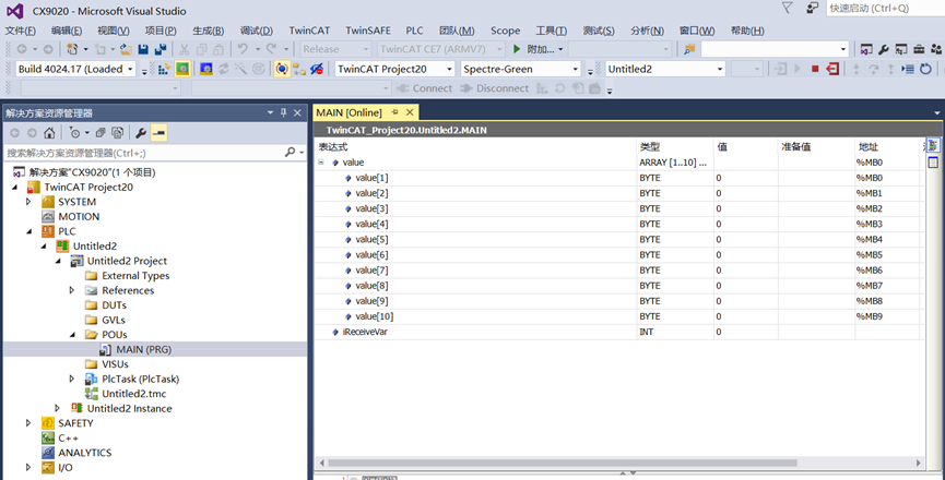 - 操作流程 1.1. CX9020从站配置 从站不需要写代码,只需要定义相互通信的变量即可,如下所示