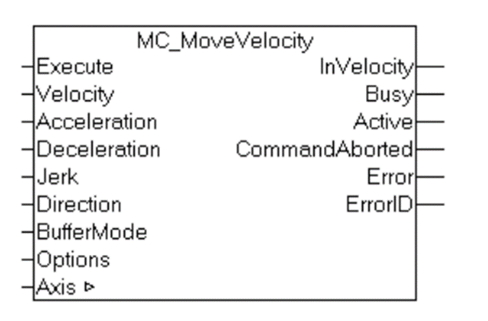 轴一直在转动,切需要运动过程中改变速度,因此可以使用速度模式指令,本文介绍速度模式功能块 MC_MoveVelocity的使用。 1.1. 功能块介绍 1.1.1. 功能块介绍 MC_MoveVelocity以指定的速度和方向开始连续移动。可以通过停止命令停止移动。 一旦达到恒定速度,将设置反转输出。一旦达到恒定速度,闭塞功能即完成,不再对运动进行进一步监控。如果该命令在加速阶段中止,则该命令中止,或者在出现错误时,设置错误输出。 注意:如果在轴参数中明确激活此选项,则行程命令可应用于耦合的从动轴。如果在轴参数中明确激活此选项,则可将行程命令应用于耦合的从动轴。在这种情况下,只能中止缓冲区模式。