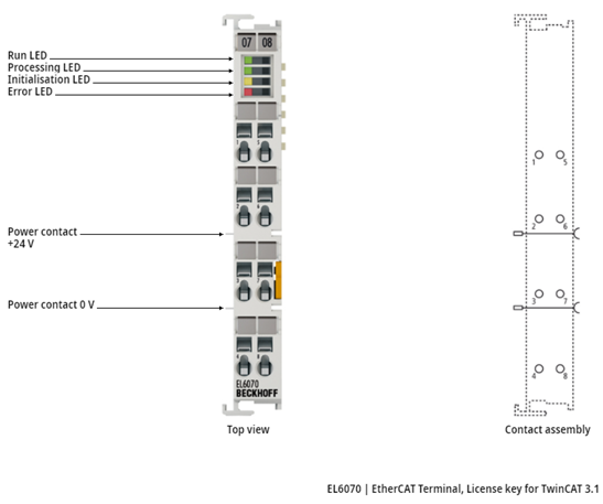 - 操作流程 1.1. EL6070模块介绍 1.1.1. 外观 TwinCAT 3.1提供了通过EtherCAT终端EL6070管理TwinCAT软件许可证的选项。EL6070包含模块化EtherCAT I/O系统中的硬件许可证密钥。数据传输通过EtherCAT进行。EL6070许可证密钥终端配有本地数据存储器,用于保存TwinCAT 3.1许可证文件。可通过TwinCAT 3.1访问。功能相当的C9900-L100许可证密钥U盘也具有此数据存储器。EtherCAT终端和USB记忆棒都具有出厂预装许可证:EL6070-0033、C9900-L100-0033。请注意,就EtherCAT而言,EL6070和EL6070-0033是两个不同的设备,因此在EtherCAT I/O配置中不可互换。