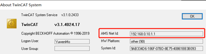 - 操作流程 1.1. ADS简介 1.1.1. ADS设备的识别 支持TwinCAT ADS 通讯的设备,称为 ADS 设备。协议规定 ADS 设备的识别方式为:NetID+Port,NetID指它所在的 TwinCAT 控制系统的识别代号,这是一个 6 段的字符串,如下所示: