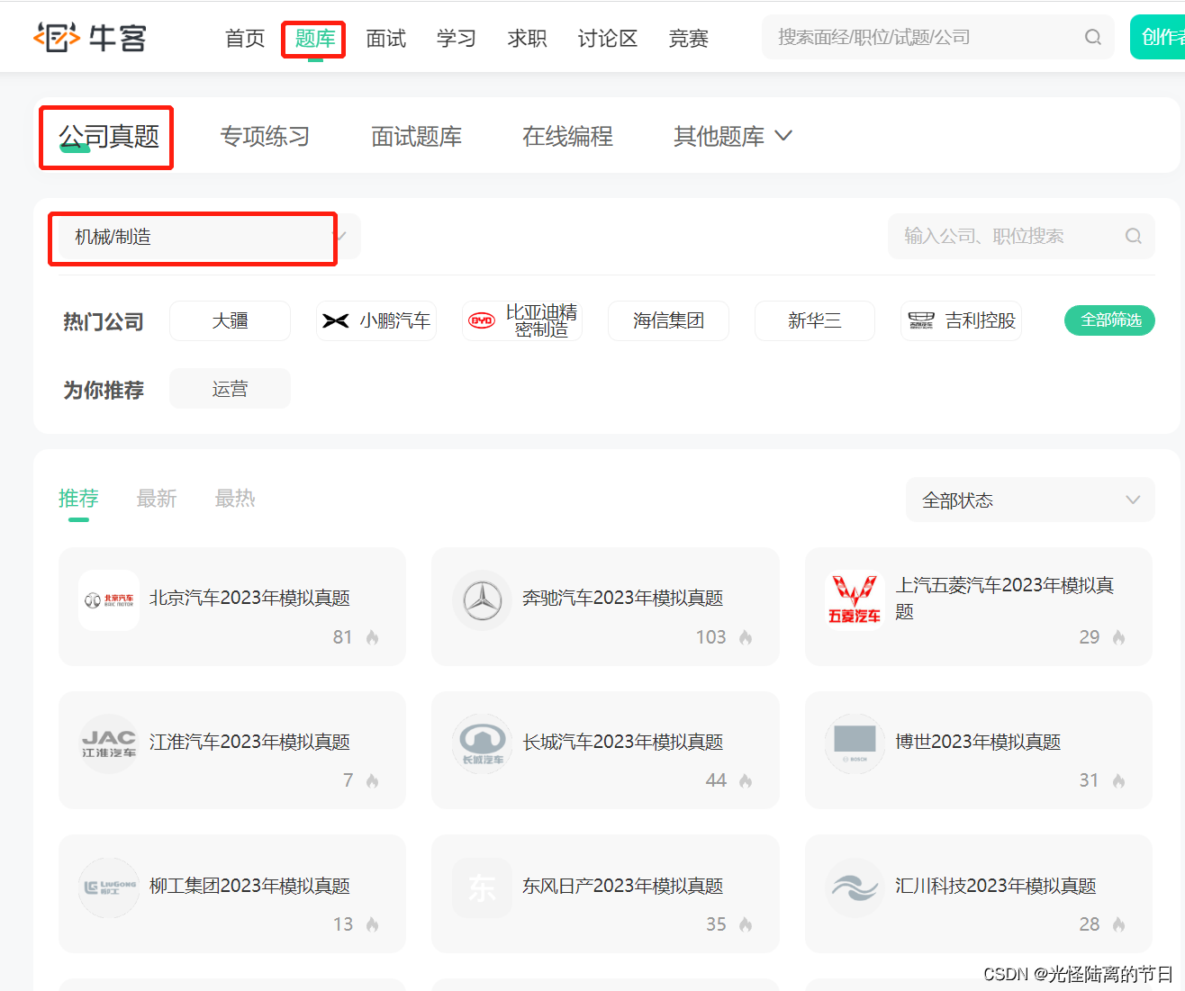 机械相关的题目在“专项”里,链接只能跳转到专项首页,需要手动选择一下。 2、行业中公司真题 https://www.nowcoder.com/link/pc_csdncpt_gglldjr_gstk