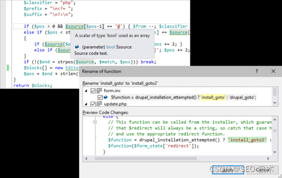 严格类型检查 - 代码诊断现在尊重该strict_types指令。每当有declare(strict_types=1); 源文件顶部的代码,隐式数字转换现在被严格处理。任何会降低值精度的转换都会报告为警告。