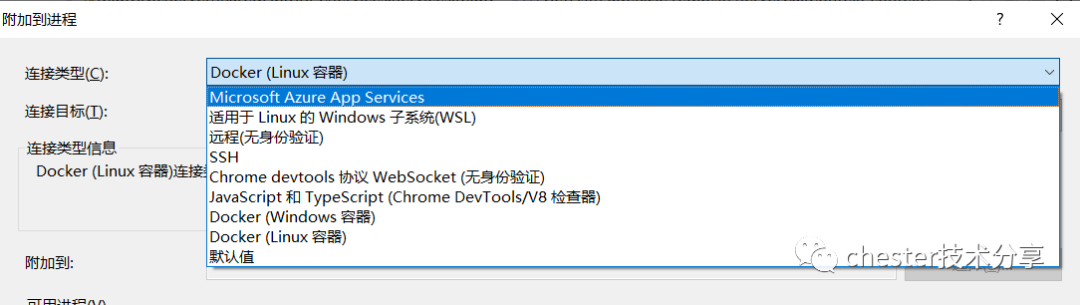 在列表中选择要附加的容器。并点击附加,弹出选项中选择托管(.NET Core For Unix)