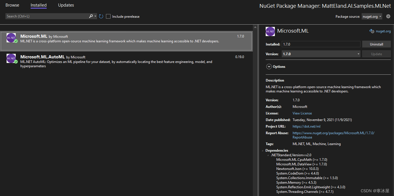 安装ML.NETML.NET可以通过Visual Studio中的NuGet包管理器为任何支持.NET Standard的项目安装(几乎所有.NET项目都可以这样做)。