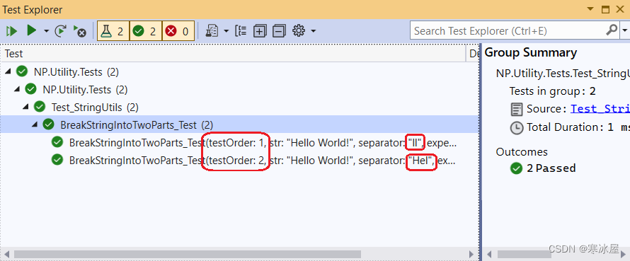 测试资源管理器中的测试根据它们的参数值按字母数字排序——因为第二个InlineData("Hel")的分隔符参数在字母数字上位于第一个InlineData的分隔符"ll"之前,因此相应的测试以相反的顺序出现。
