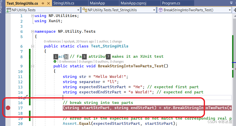 在测试方法中放置一个断点,例如,在BreakStringIntoTwoParts(...)方法调用旁边:
