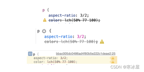 从上到下:Chromium、Firefox和Safari 开发工具表明缺乏对lch颜色的支持,Safari也不支持宽高比。(大预览)