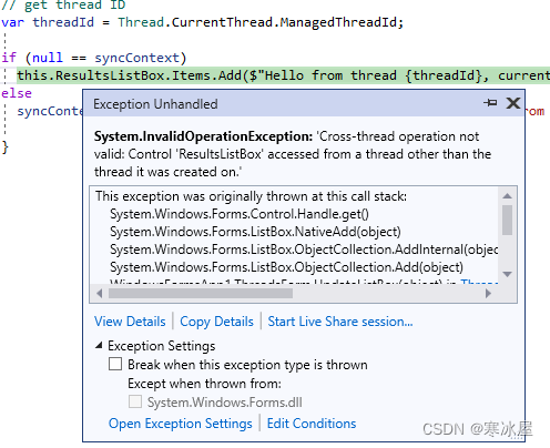 this.ResultsListBox.Items.Add($"{ex.GetType().Name} caught from thread {threadId}");