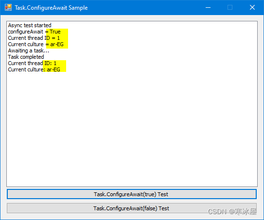 代码只是等待任务并根据单击的按钮进行ConfigureAwait()切换。它还在切换之前更改当前线程的文化信息。运行表单并单击“ConfigureAwait(true)”按钮。