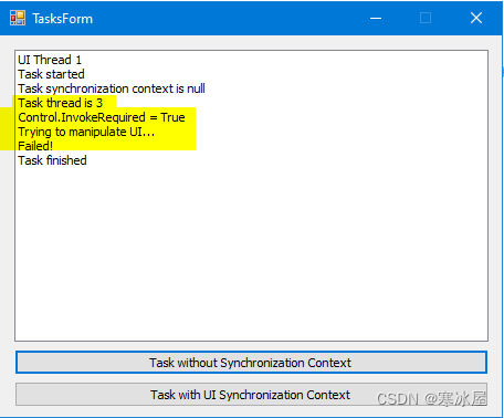 之后的await代码运行在不同的线程中,无法直接访问控件。现在,点击UI-context按钮并查看结果:
