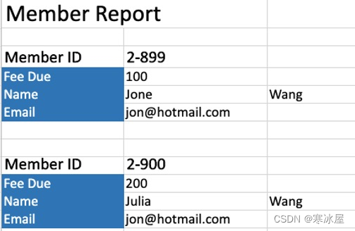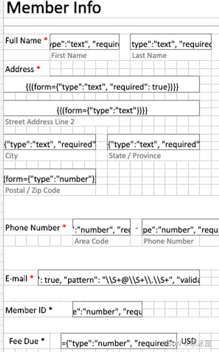 为了生成包含所有成员的表单条目的Excel电子表格,我们创建了一个Excel数据源模板,如下所示: