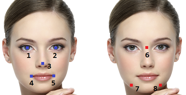 看看下面的图片。在左侧,我们绘制了使用MTCNN算法找到的关键点。在右侧,我们显示了可以根据三个关键点的已知坐标计算的三个点:1、2 和 3。