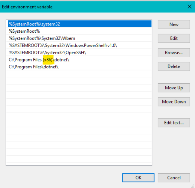 确保您有一个条目为C:\Program Files\dotnet,如果您看到一个条目为C:\Program Files(x86)\dotnet,请将其删除。现在,如果你运行dotnet –info,你应该看到: