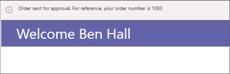 在我们将商品添加到我们的订单并将其发送以供批准后,应用程序会将我们返回到主页面,并带有一条包含我们订单号的消息。