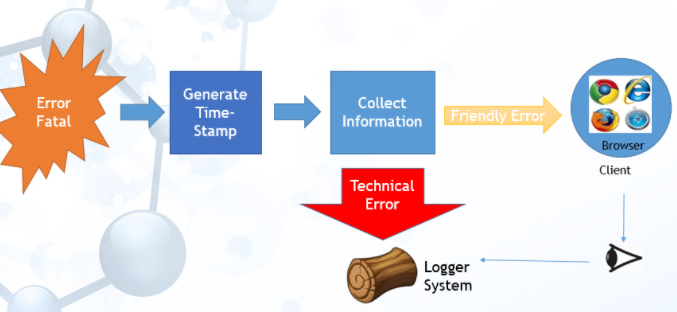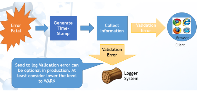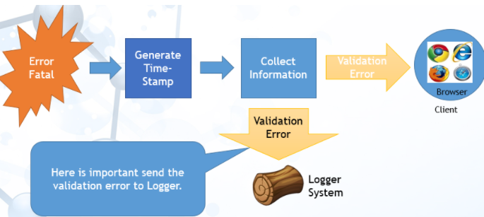 在开发的情况下,我们可以简单地将技术错误发送到浏览器,因为只有开发团队和可能的QA团队才能看到信息。此外,我们还需要将错误发送到日志记录器系统,并维护发送到浏览器的错误与日志条目之间的关系。