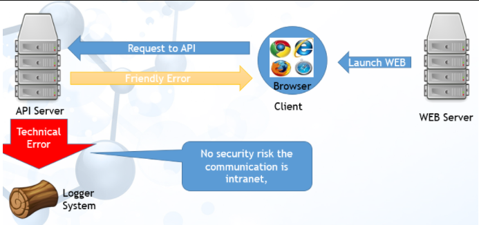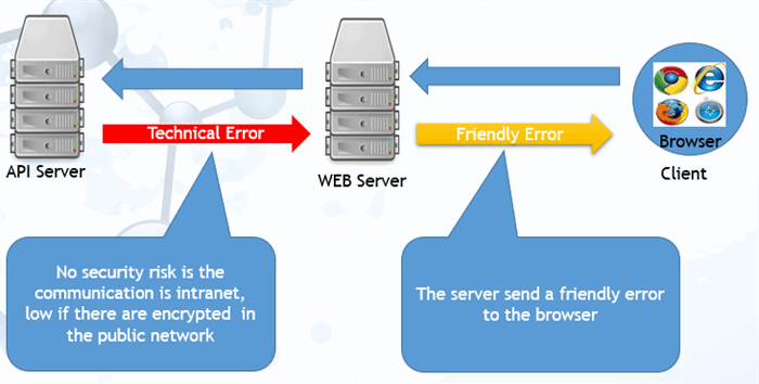 随着基于客户端的Web作为Angular和其他框架的流行,对API服务的调用是直接从浏览器完成的。这意味着,如果您继续以服务器基础WEB类型ASP.NET或NET MVC中使用的相同方式发送错误信息,则错误的技术细节将被潜在黑客以明文形式发现浏览器,无论您使用什么协议来保护信息。这种情况是我们系统中的一个重要安全漏洞。