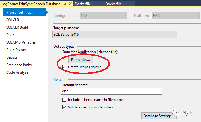 SQL SERVER LINUX 容器化在LogCorner.EduSync.Speech.Database项目中,打开项目属性,然后单击Project Settings选项卡,然后选中Create script (.sql file)