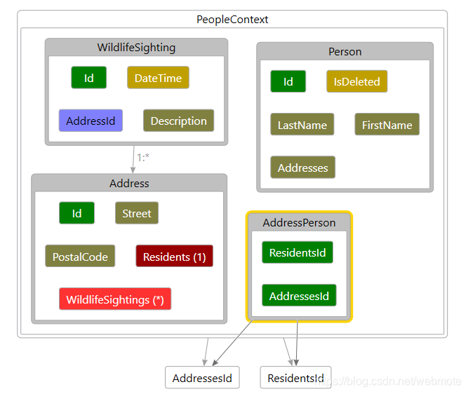 您可以在此视图中看到一个Addresses属性。实际上,使用导航,“人”和“地址”之间存在多对多关系。EF Core在运行时推断内存中的PersonAddress实体,以便将关系数据持久化到联接表中。