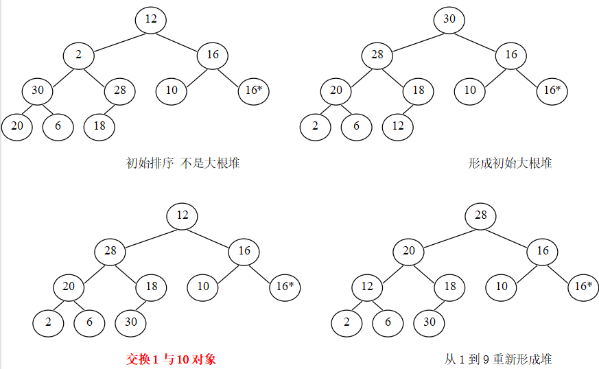 第一步,形成初始大根堆(详细过程略),第二步做堆排序。