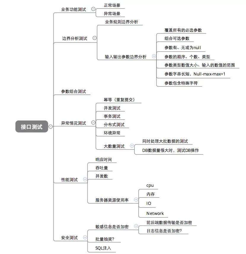 流程: 1.需求讨论 2.需求评审 3.场景设计 4.用例设计 5.数据准备 6.执行分析接口文档,提取测试点: 1.输入:接受哪些参数、参数的类型、可选参数和必选参数等;根据输入参数采用等价类、边界值分析法等进行设计; 2.业务逻辑:对于个接口,不同的输入参数或组合,流程或状态的转移是不同,可以根据业务逻辑画出流程图或状态转移图,确保每种状态至少被访问了一次 ; 3.输出:根据文档规定的输出,反向设计测试数据,使所有的输出状态都被包含了;用例设计: 1.功能(功能正常:正常登录、按接口文档实现) 2.逻辑业务(是否依赖业务:是否登录) 3.异常: 参数异常(参数关键字、参数为空、多/少个参数、错误参数) 数据异常(关键字数据、数据为空、长度不一致、错误数据) 4.安全: cookie(有无cookie) header(有无header) 唯一识别码(手机唯一识别码) 那么接口测试的用例则是来源与系统的数据交互设计方案、架构的设计,也就是普遍针对开发内容细节的正确性测试