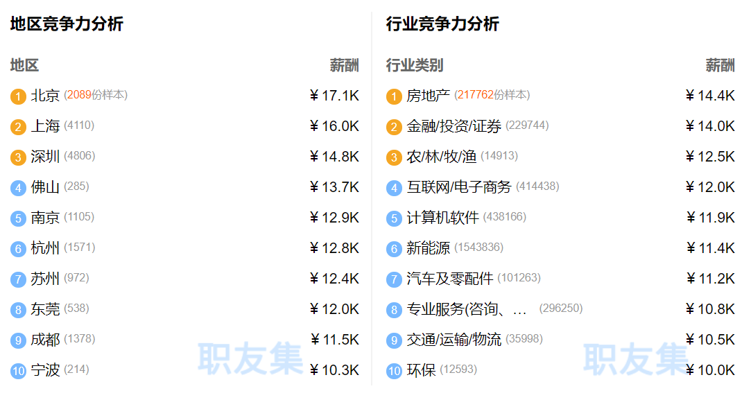 而关于城市竞争力,北京、上海、深圳依然位列前三,行业竞争力方面,房地产、金融/投资/证券类,薪资明显高于其他行业,农/林/牧/渔紧随其后,互联网/电子商务已排行第四。