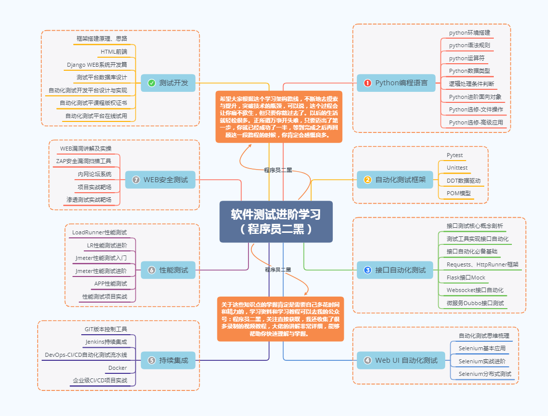 下面是详细的学习路线及资源: 上面就是我整理出来的一份自动化测试工程师技术路径图。希望大家能在这个成长过程中收益良多。全方位提升测试技术,建立一套属于自己的技术体系。帮助大家不断学习和优化技术栈,跟进先进和主流的测试技术,给到大家带来的不仅仅是技术和薪资的提升,更多的是改变测试人在IT技术领域的地位和心态,拔高测试行业的技术深度。