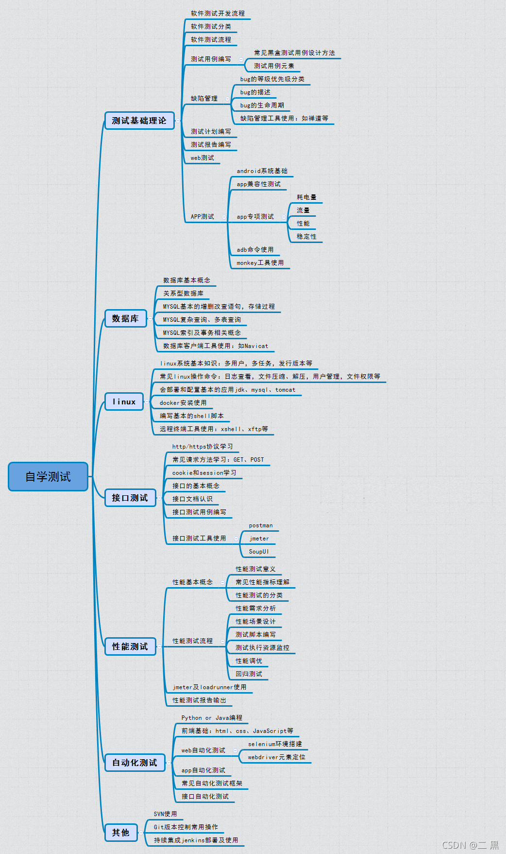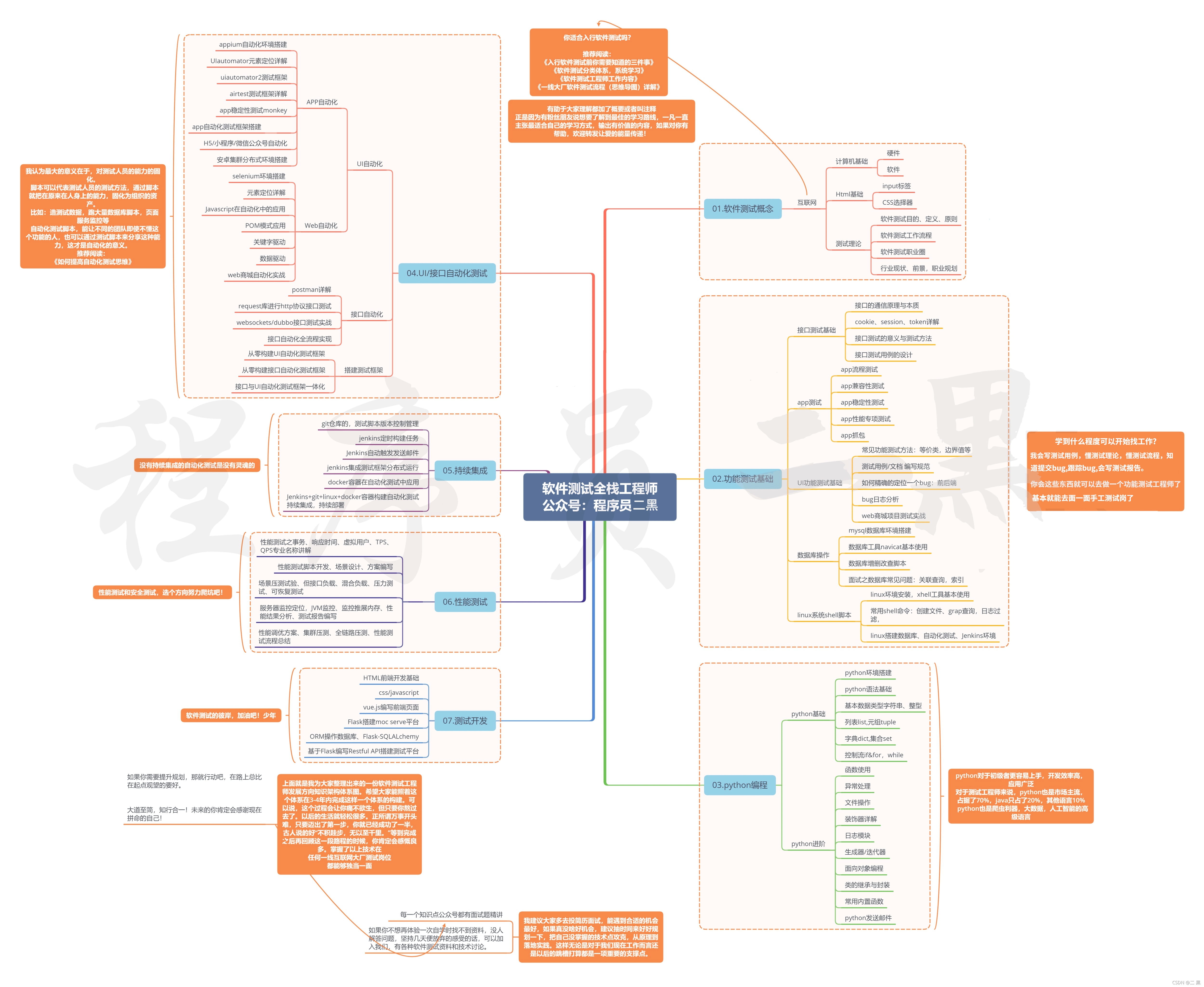如果看不清,需要高清脑图或者是软件测试资料可以关注我公众号:程序员二黑,免费获取!