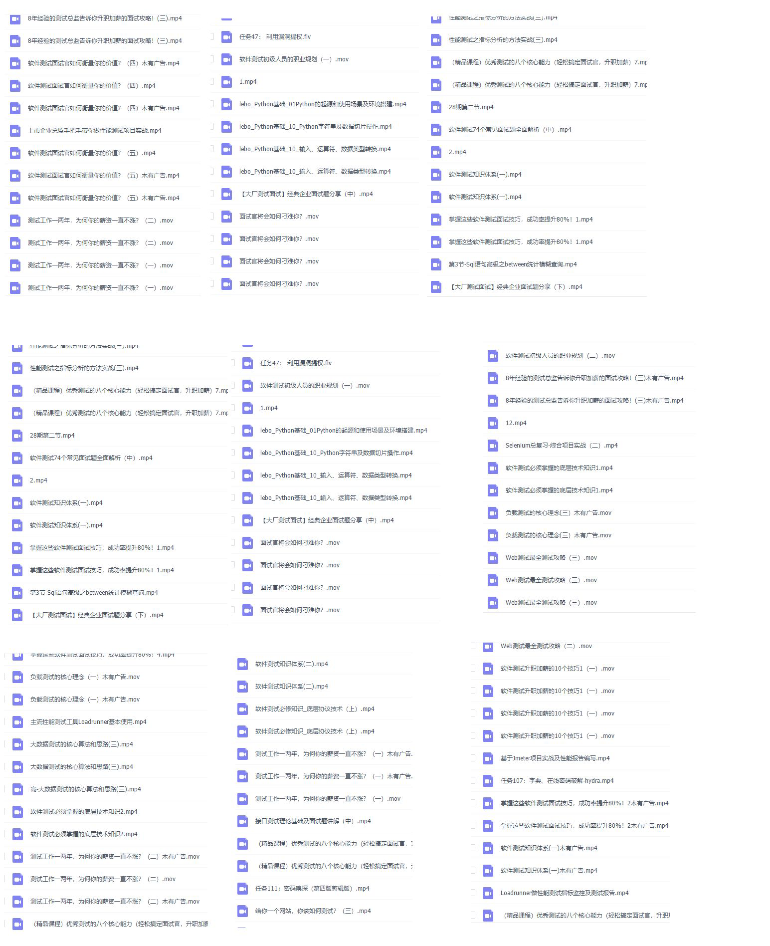 最后也分享一些我的学习的资料 对于自学软件测试的小伙伴来说应该会很有帮助,为了更好地整理每个模块,我也参考了很多网上的优质博文和项目,力求不漏掉每一个知识点,很多朋友靠着这些内容进行复习,拿到了BATJ等大厂的offer,这份资料也帮助我渡过最艰难的时期,希望也能帮助到你。关注我的微信公众号:程序员二黑,就可以免费获取!