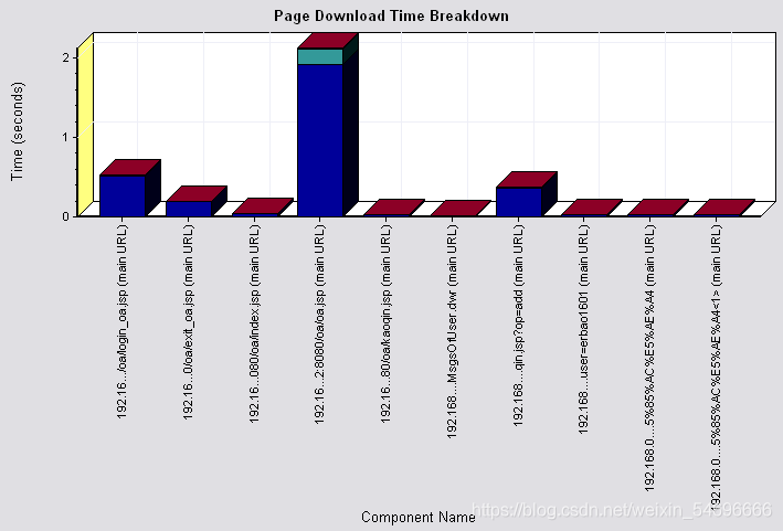 在监控图列表中,我们看到图1- 15,从图中我们看到,在所有的页面中,登录后的用个人面页面“http://192.168.0.52:8080/oa/oa.jsp”的下载时间最长。