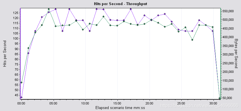 图1- 11显示的是“Hits per Second”与“Average Throughput (bytes/second)”的复合图,从图中可以看出,两种图形的曲线都正常并且基本一致,说明服务器能及时的接受客户端的请求,并能够返回结果。